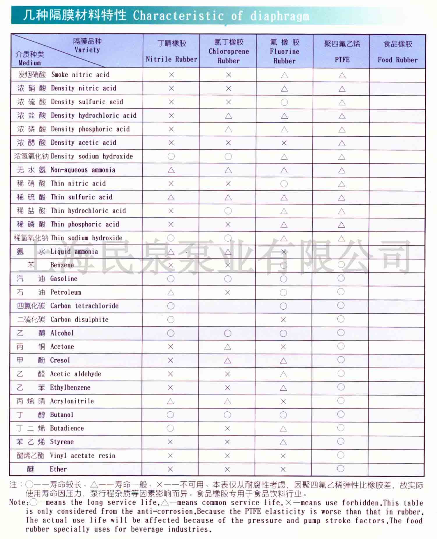 下面讓上海民泉介紹隔膜泵常用的幾種隔膜片材料的性能對比。